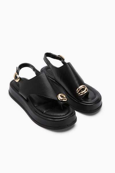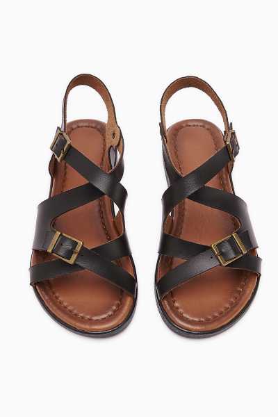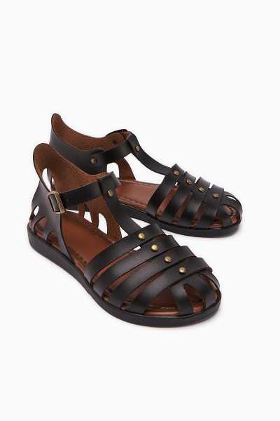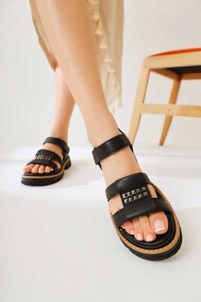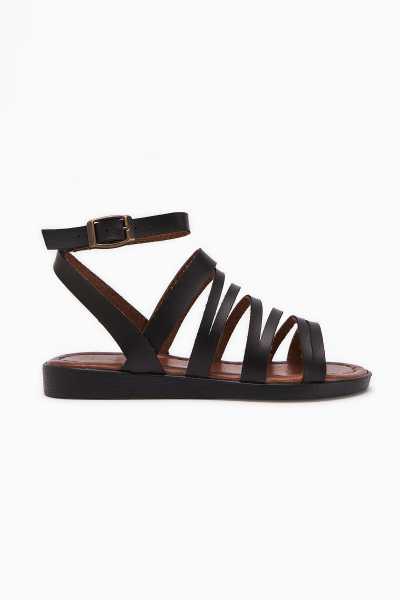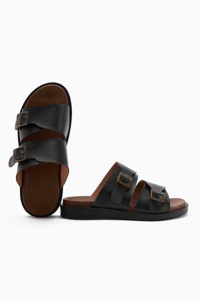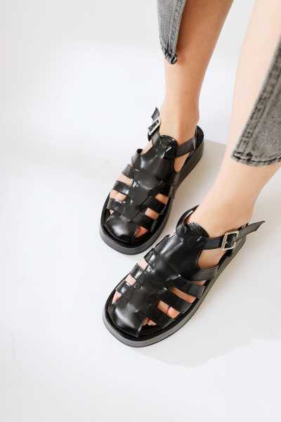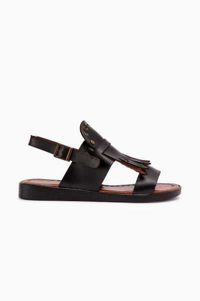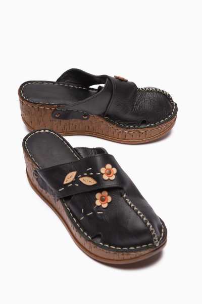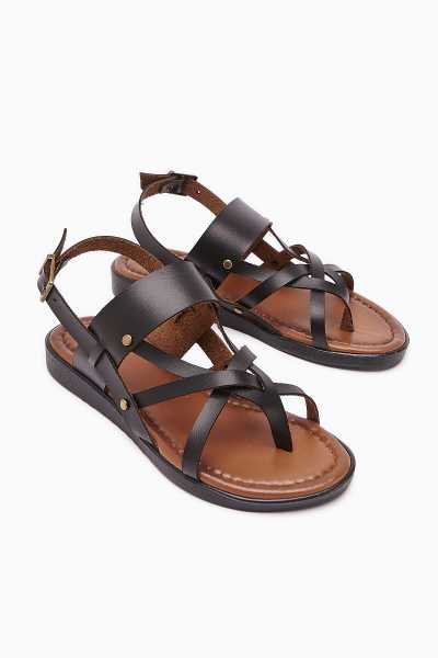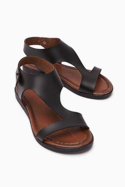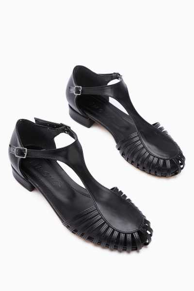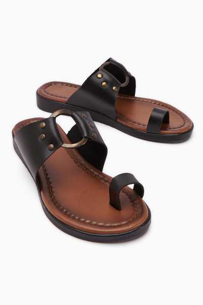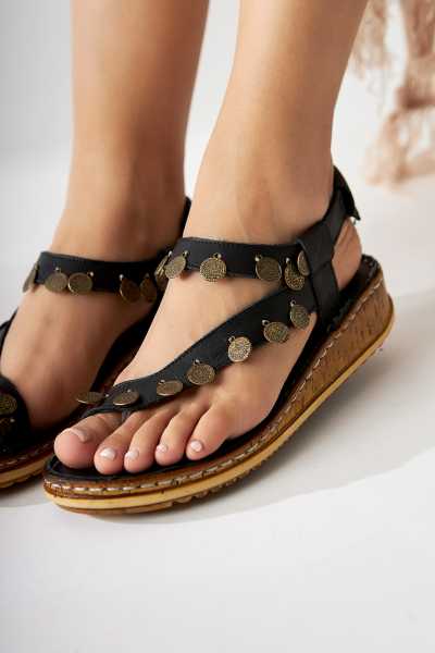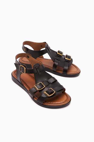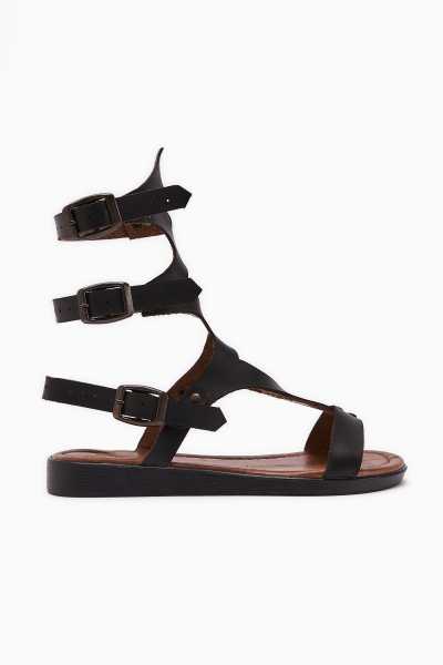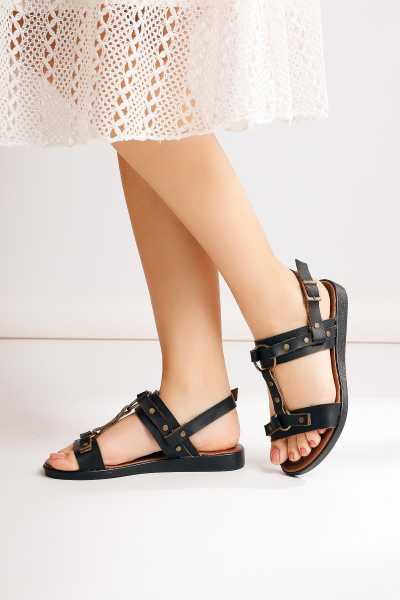 Hakiki Deri Lilah Siyah Antik Detaylı Sandalet