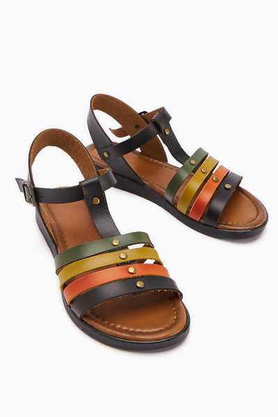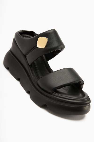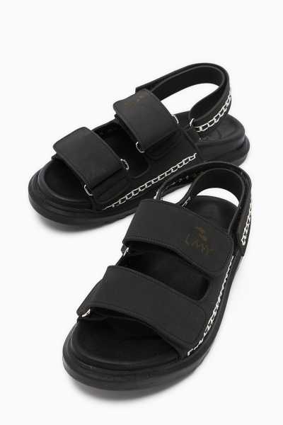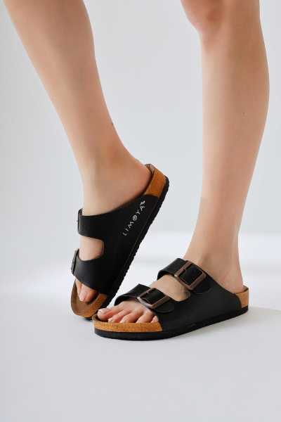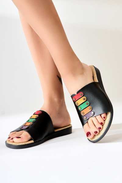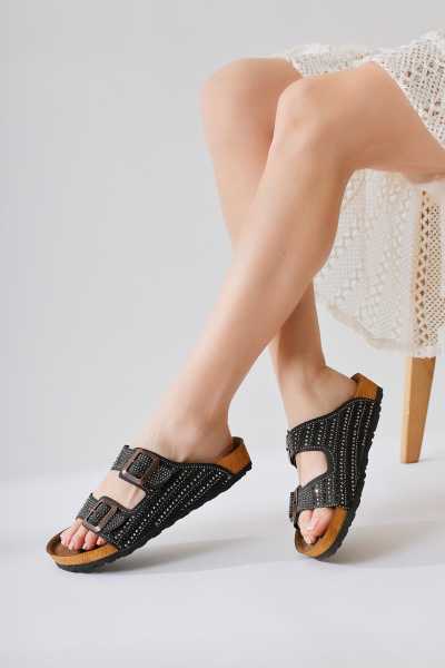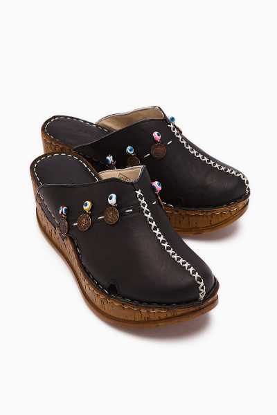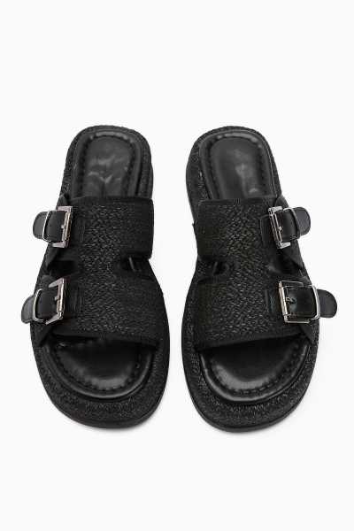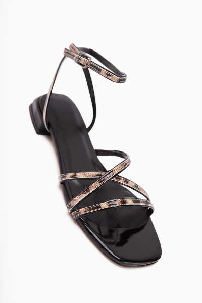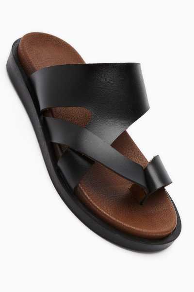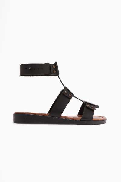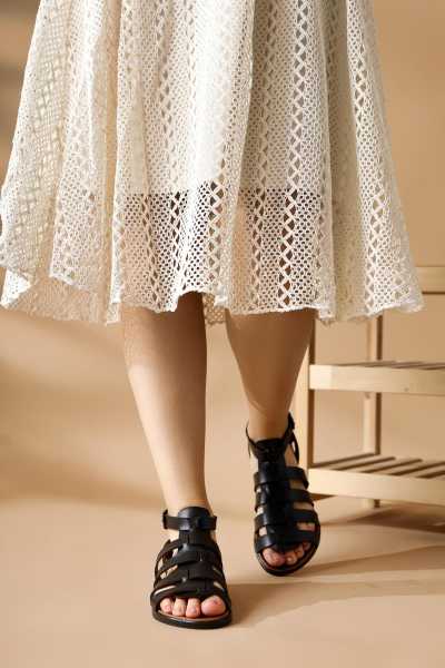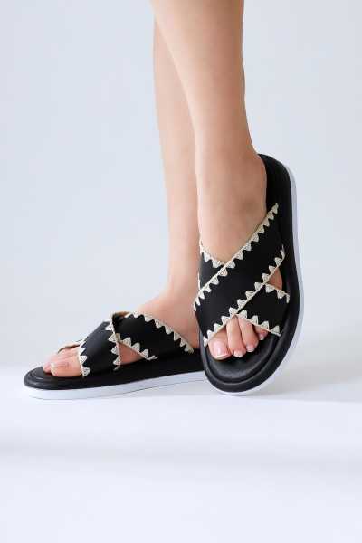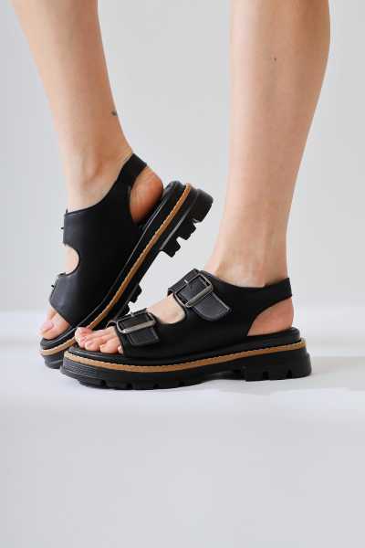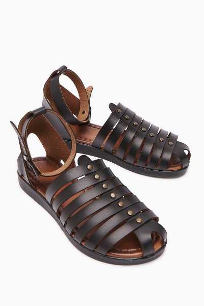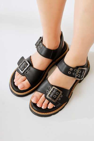 Hakiki Deri Lilah Siyah Antik Detaylı Sandalet