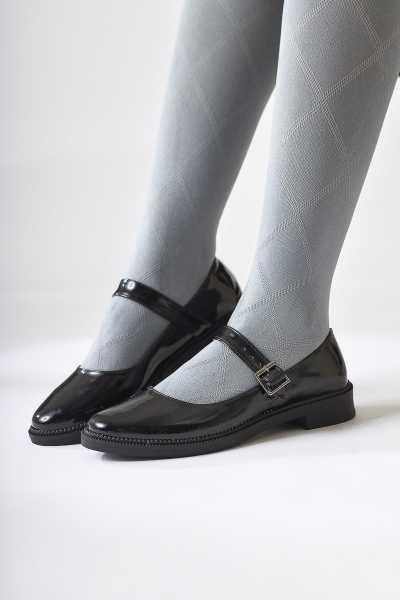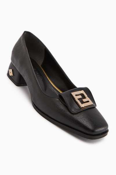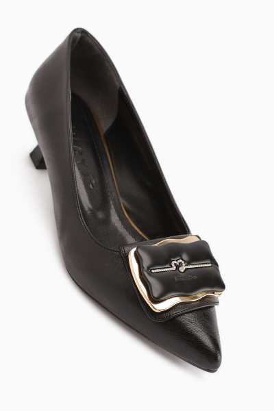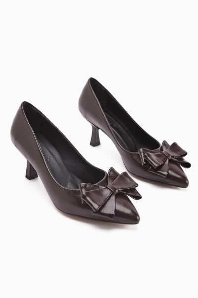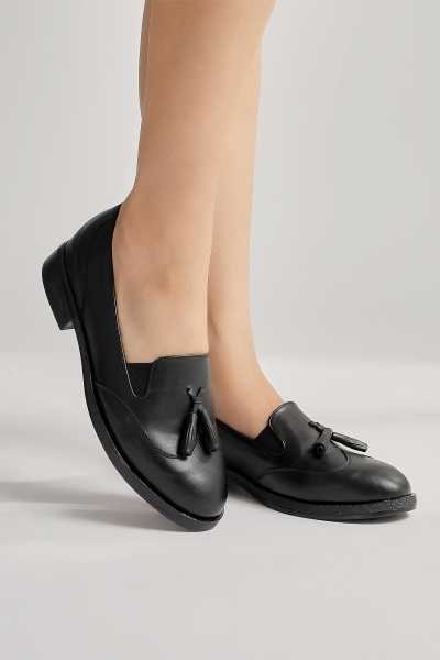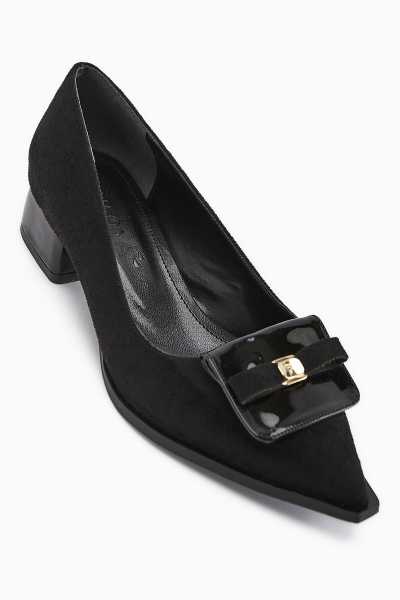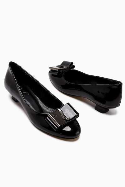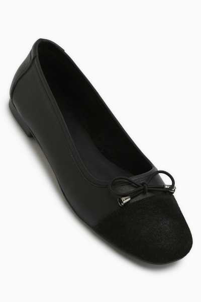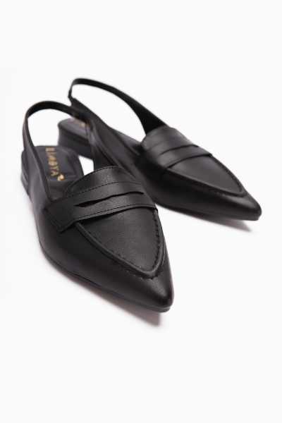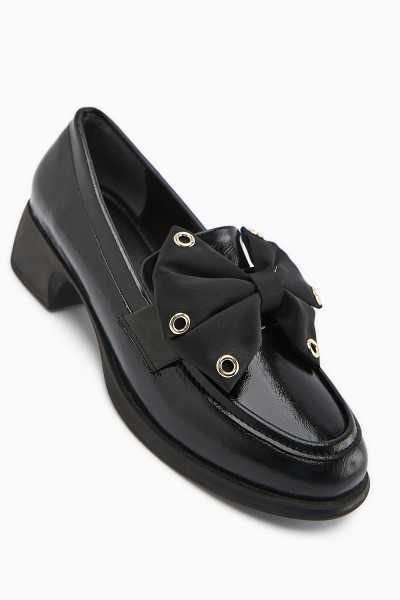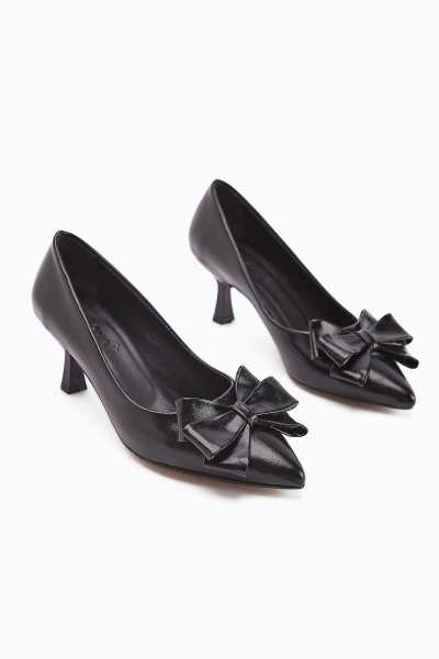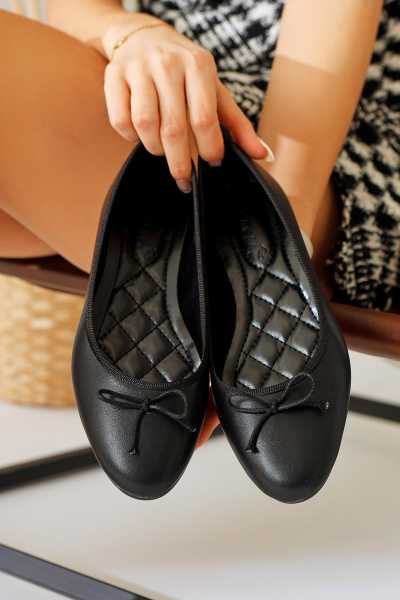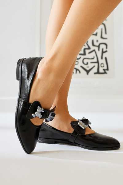 Anjela Hakiki Deri Siyah Fiyonk Detaylı Kadın Babet Ayakkabı