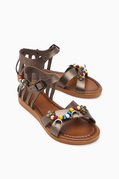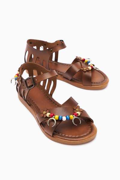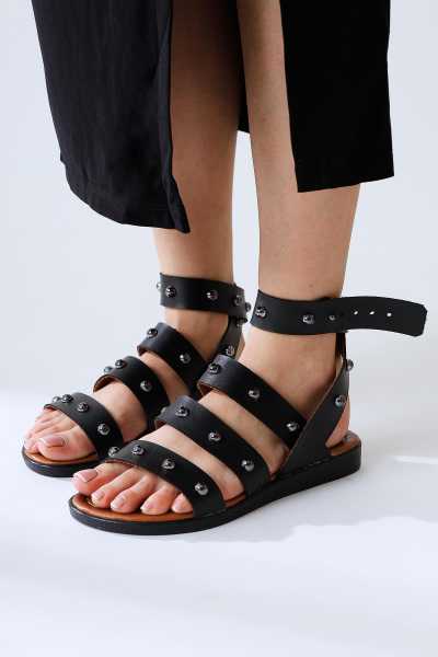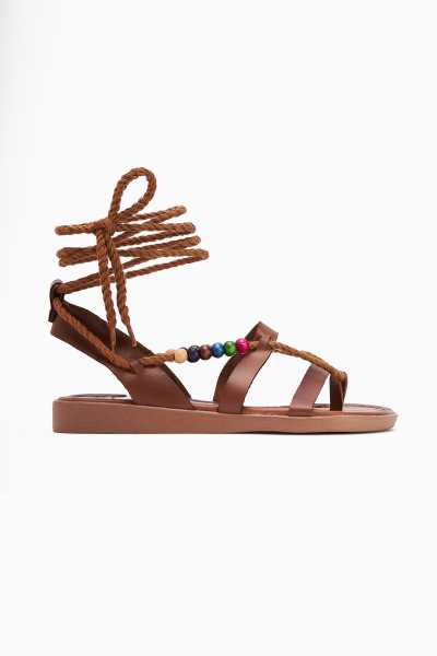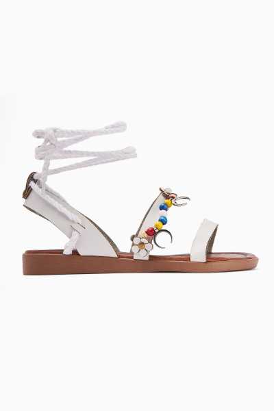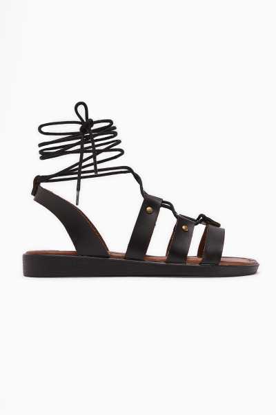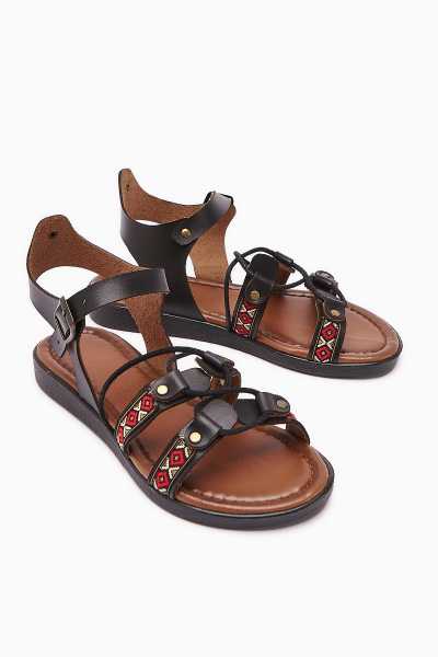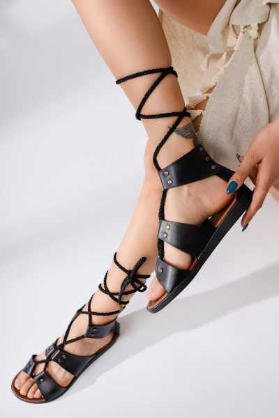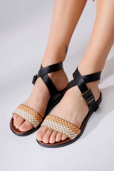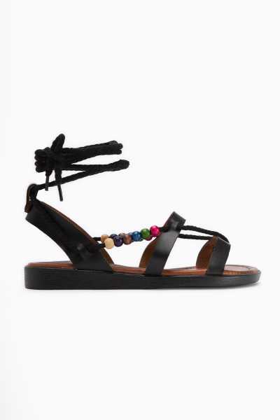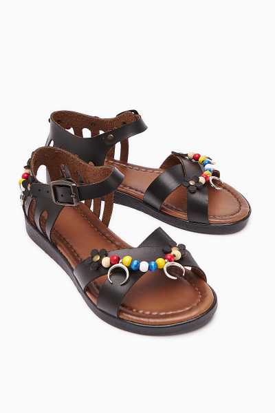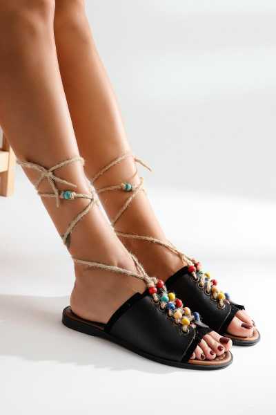 Hakiki Deri Cayla Siyah Boncuk Detaylı Bilekten Bağlamalı Sandalet