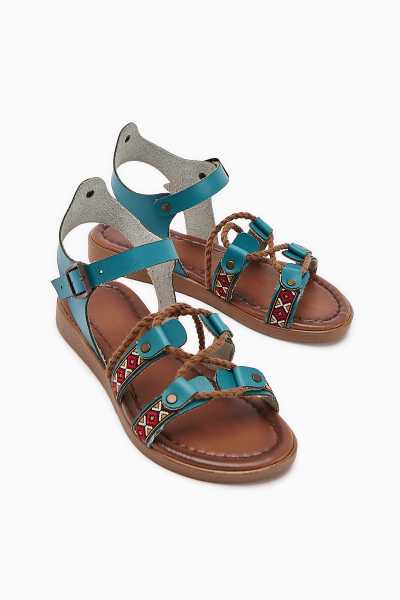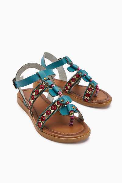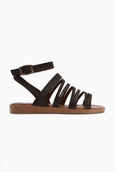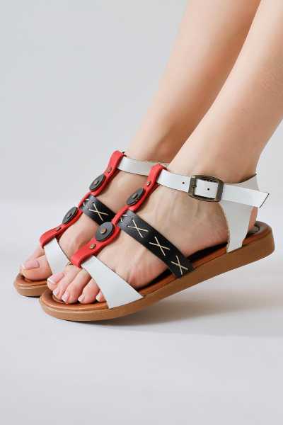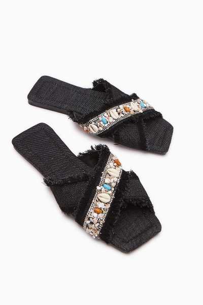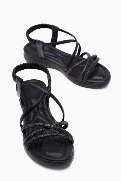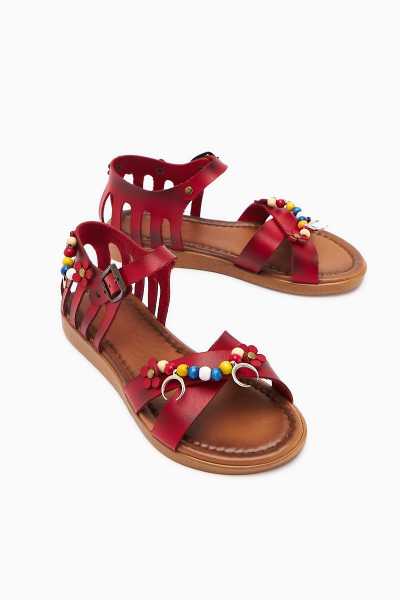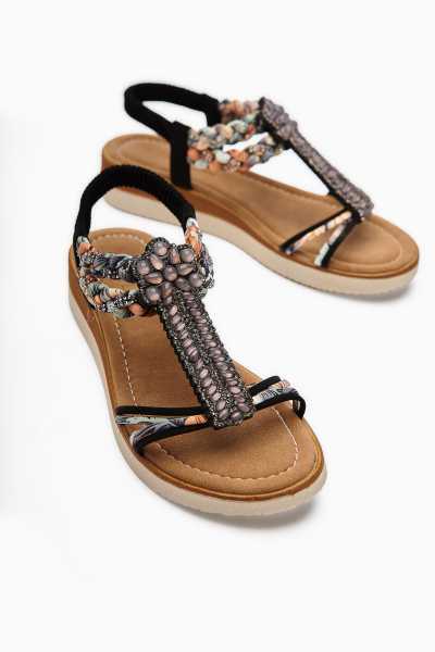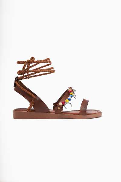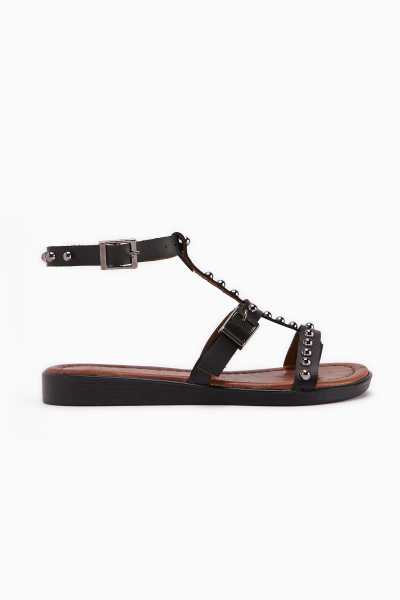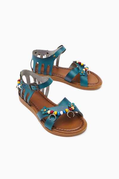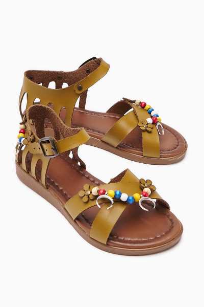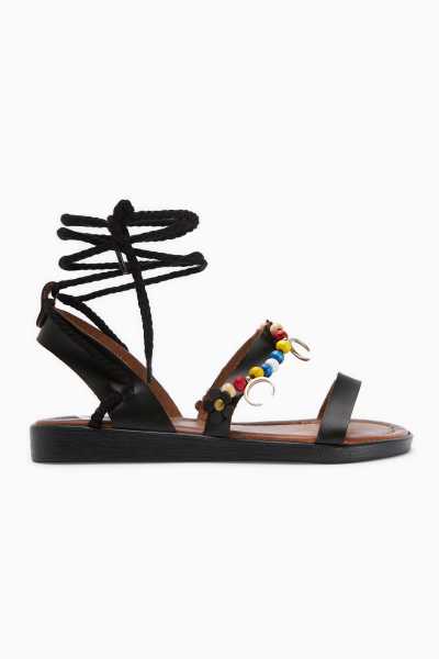 Hakiki Deri Cayla Siyah Boncuk Detaylı Bilekten Bağlamalı Sandalet