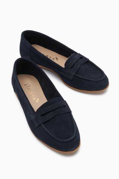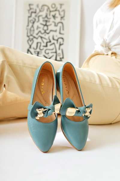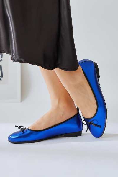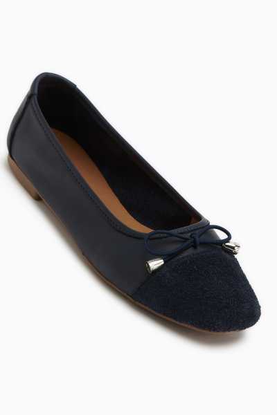 Anjela Hakiki Deri Lacivert Fiyonk Detaylı Kadın Babet Ayakkabı