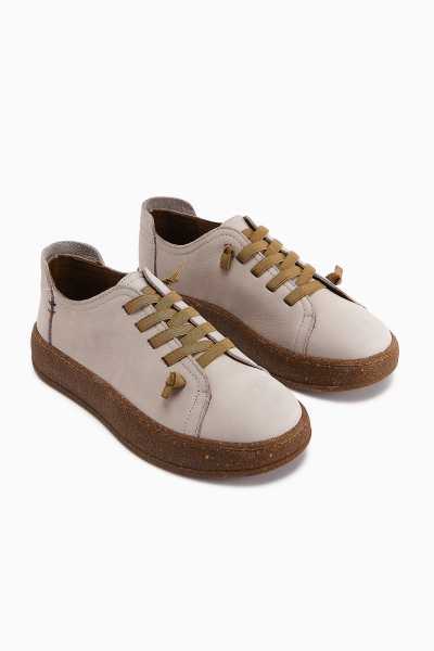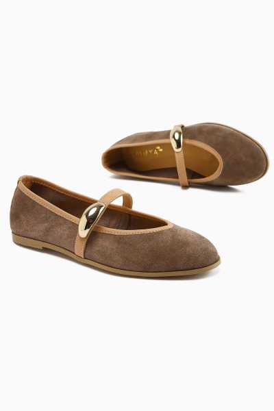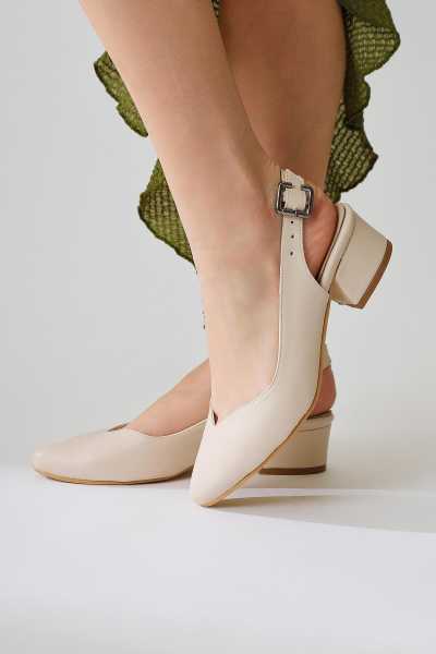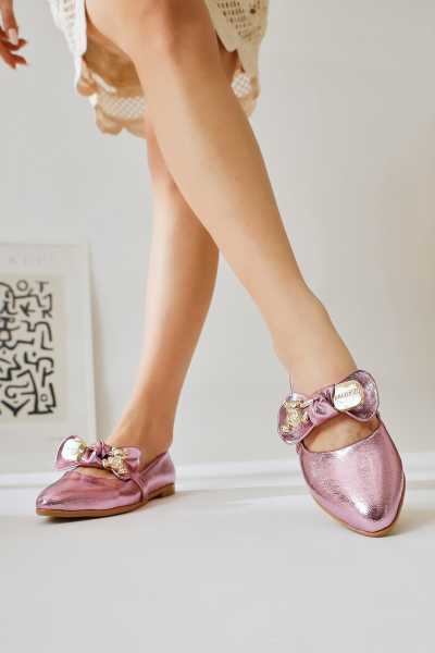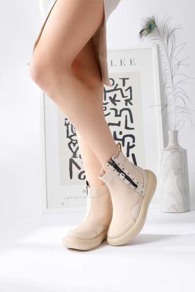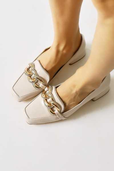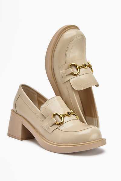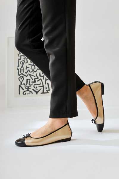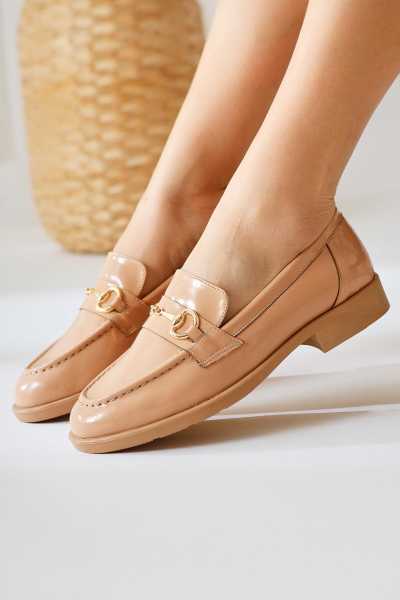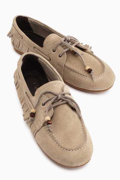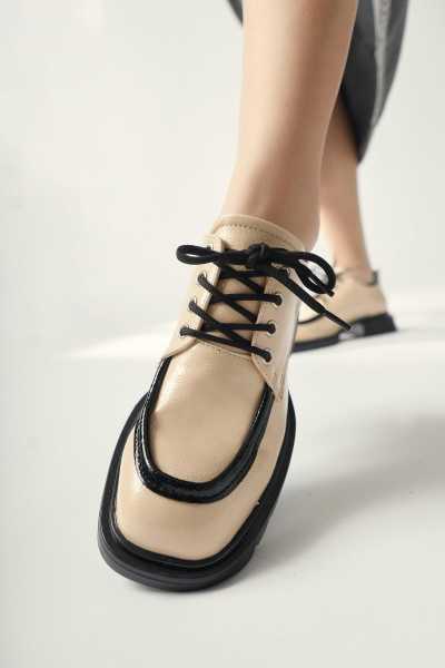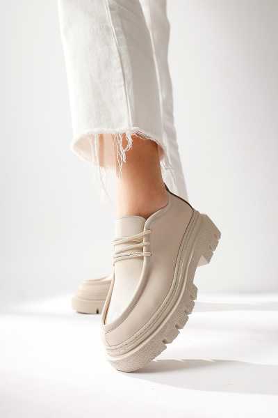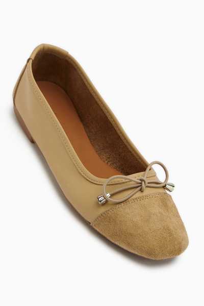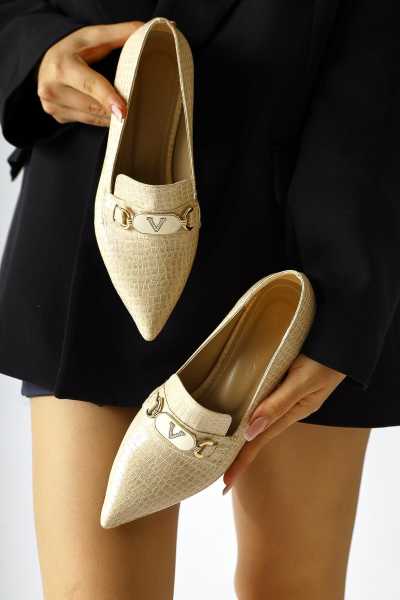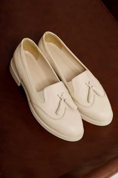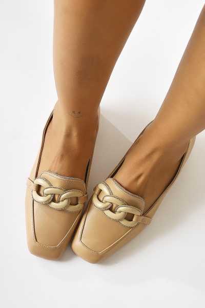 Anjela Hakiki Deri Bej Fiyonk Detaylı Kadın Babet Ayakkabı