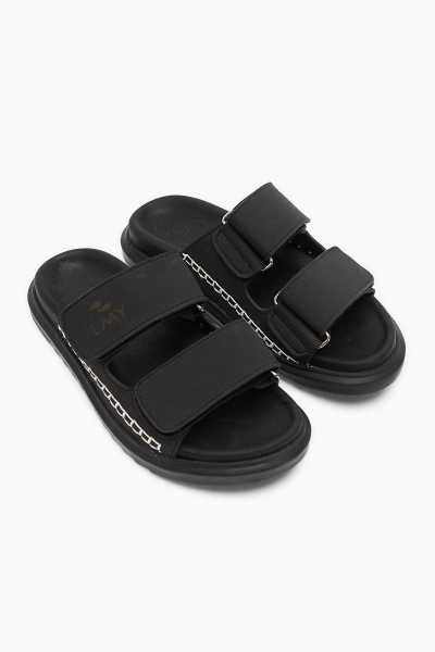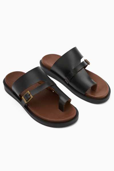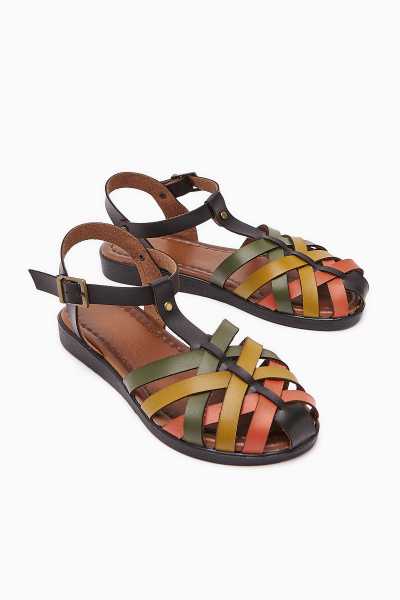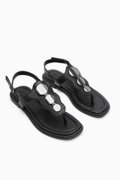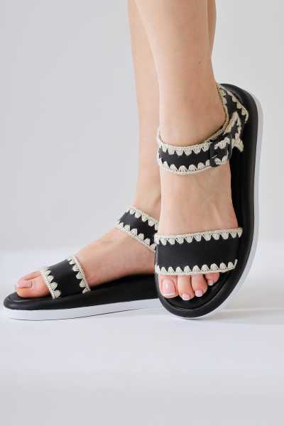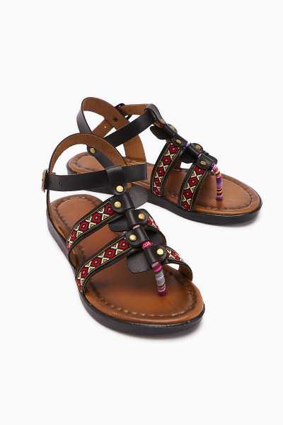 Hakiki Deri Gabrielle Siyah Parmak Arası Ayarlanabilir Etnik Desenli Düz Sandalet