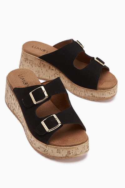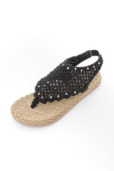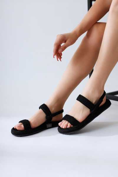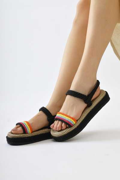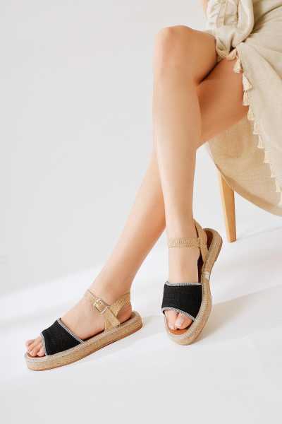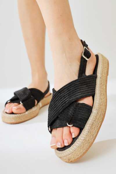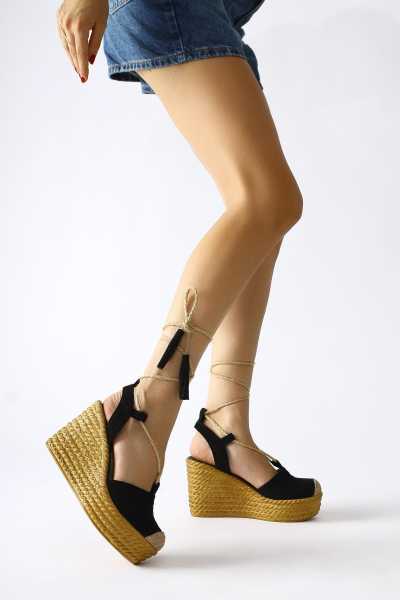 Bella Siyah Süet Dolgu Tabanlı Hasır Bilekten Bağlamalı Sandalet