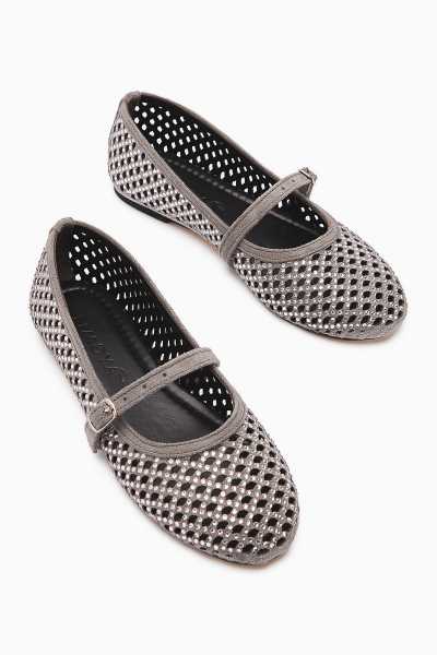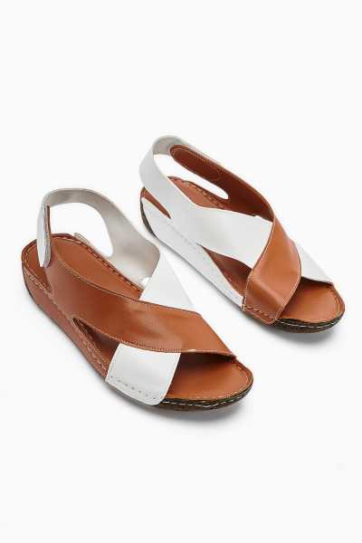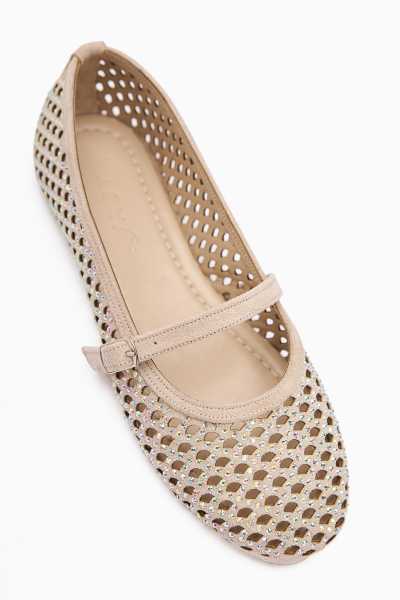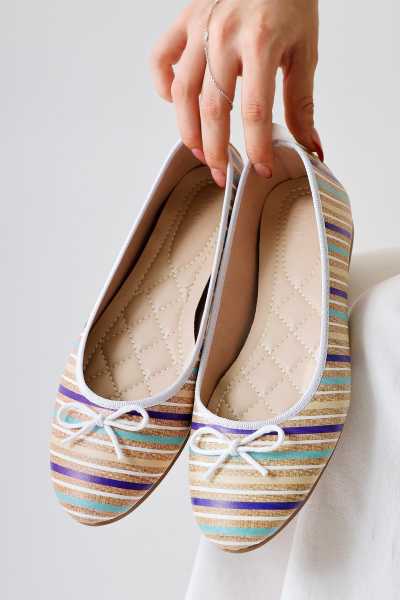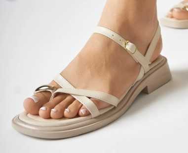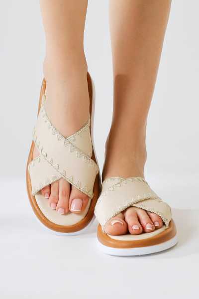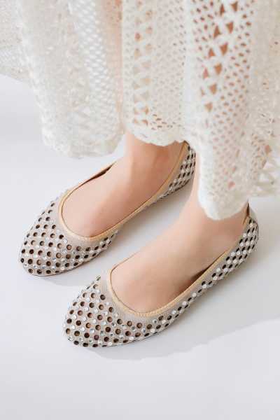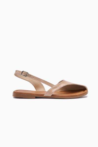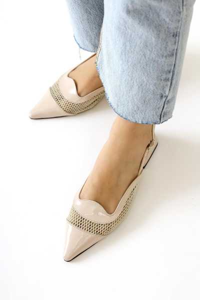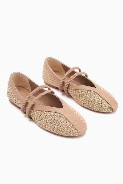 Ameli Hakiki Deri Bej Çapraz Bantlı Balerin Kadın Ayakkabısı